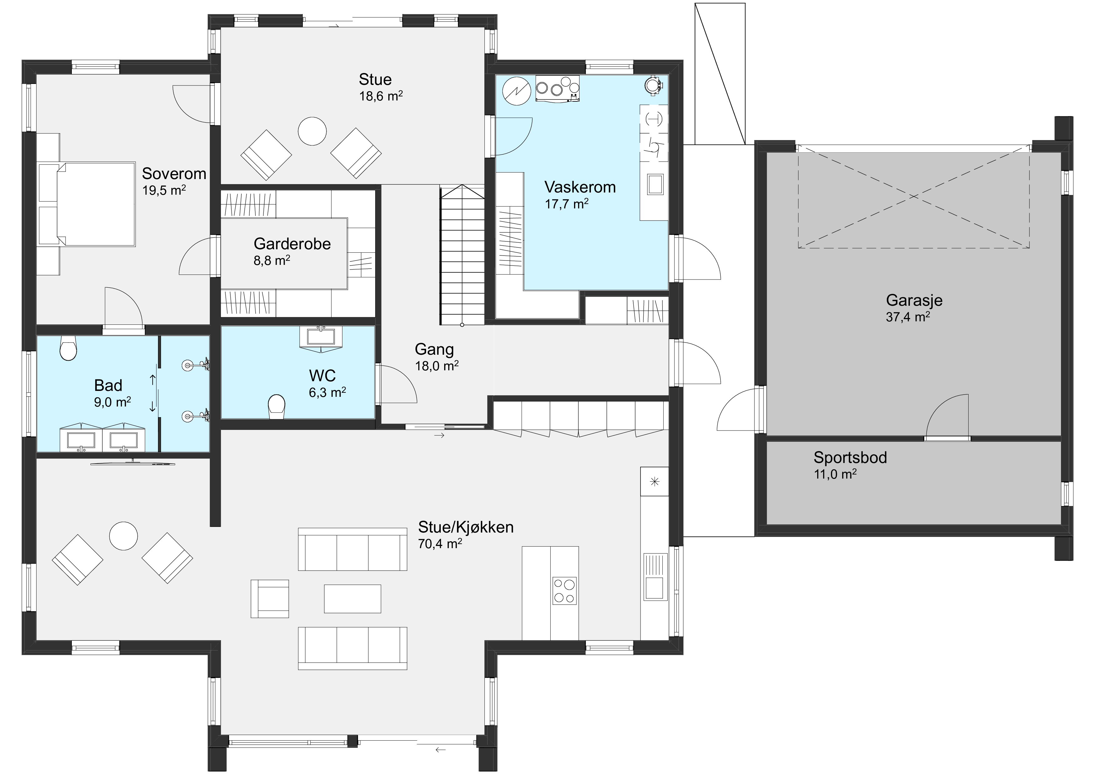 Her er det god plass til fellesskap, samtidig som planløsningen gir mulighet for privatliv når det trengs.